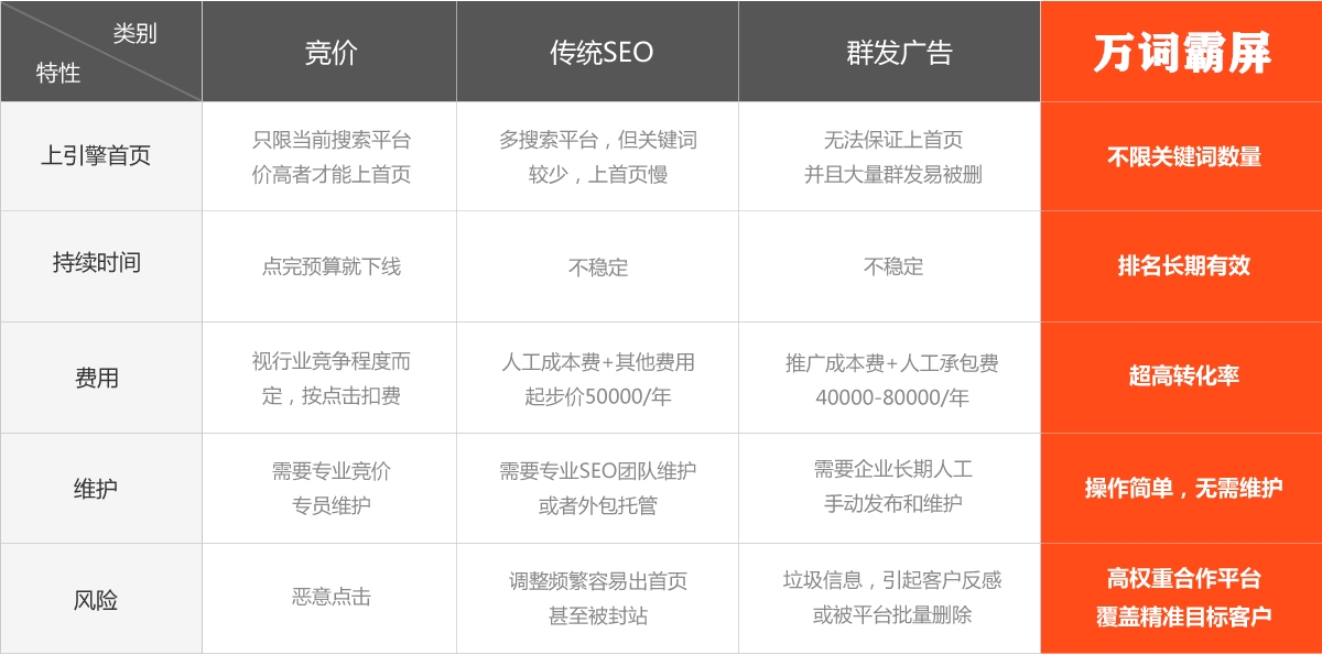 万词霸屏能解决医疗、金融、传统行业推广问题,关键词1-7天霸屏首页,让网站流量飙升,4种霸屏技术轮流上,不再担心百度调整,排名稳定。